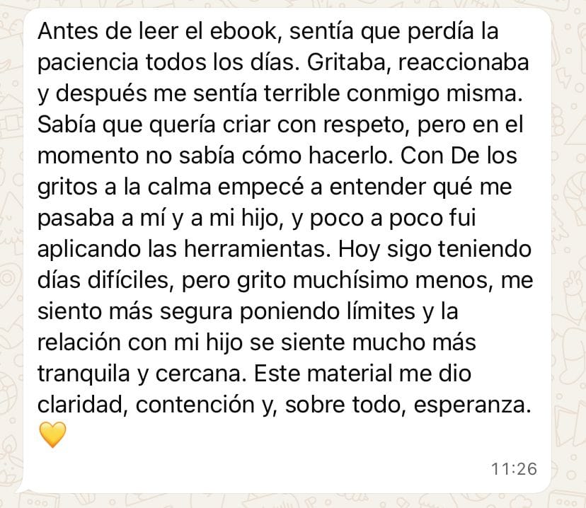 Sí. Muchos padres llegan con esa sensación. Este material no se queda en la idea de “no gritar”, sino que te ayuda a entender qué hacer en los momentos difíciles, cuando el cansancio y el enojo aparecen. Ahí es donde suele fallar lo que encontramos en redes.