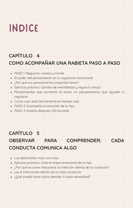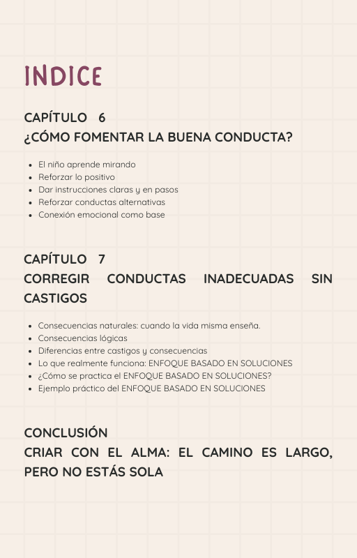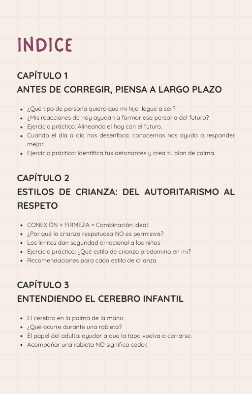 Es un material muy práctico. Incluye ejemplos reales, frases listas para usar, situaciones cotidianas (pantallas, rutinas, berrinches, límites) y herramientas que puedes aplicar desde el primer día. La teoría se explica de forma simple para que sepas por qué funciona lo que estás haciendo.